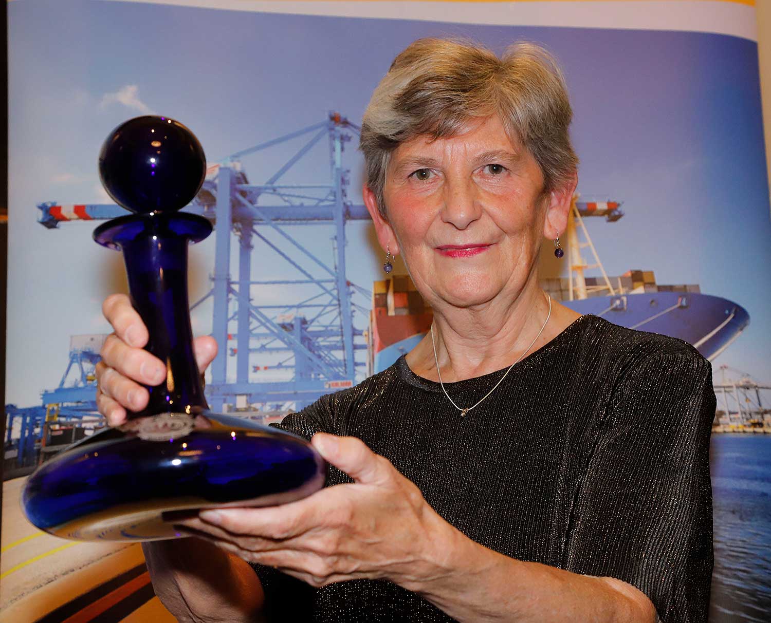 Rita Barnish with the Association’s Edward (“Ted”) Renshaw Award of the Bristol Blue Captain’s Decanter.