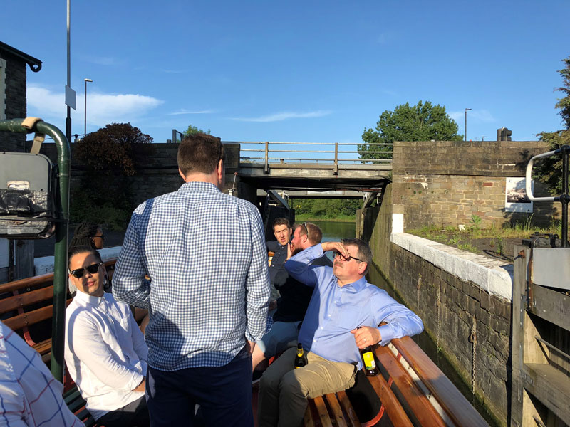 Members and their guests enjoying the evening sunshine and some refreshment, totally oblivious to the “Tower Belle” negotiating the Netham Lock to enter the River Avon.