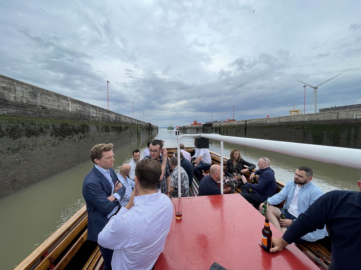 Members disembarking after transiting the lock at Cumberland Basin before disembarking alongside “The Pumphouse” a dockside pub for a Fish & Chip Supper to end the evening.